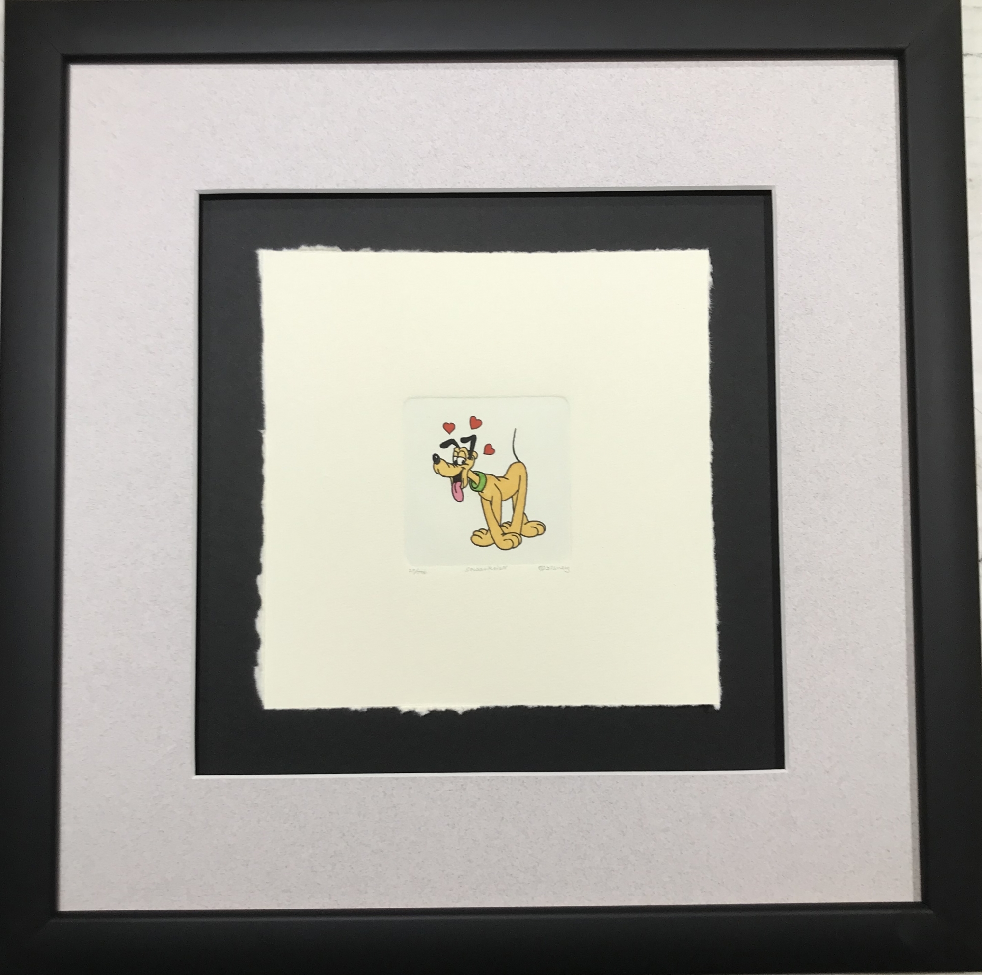 Man's best friend Pluto is just head over heals in love in this adorable hand painted etching. Available unframed for only $75US!