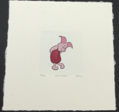 In order to create limited edition etchings, a studio-authorized artist etches or scrapes an image into a copper plate. This plate is then inked and pressed into high-quality acid-free rag paper to create the black outline of the character. Each piece is then meticulously hand-painted with watercolours to bring the image to life.