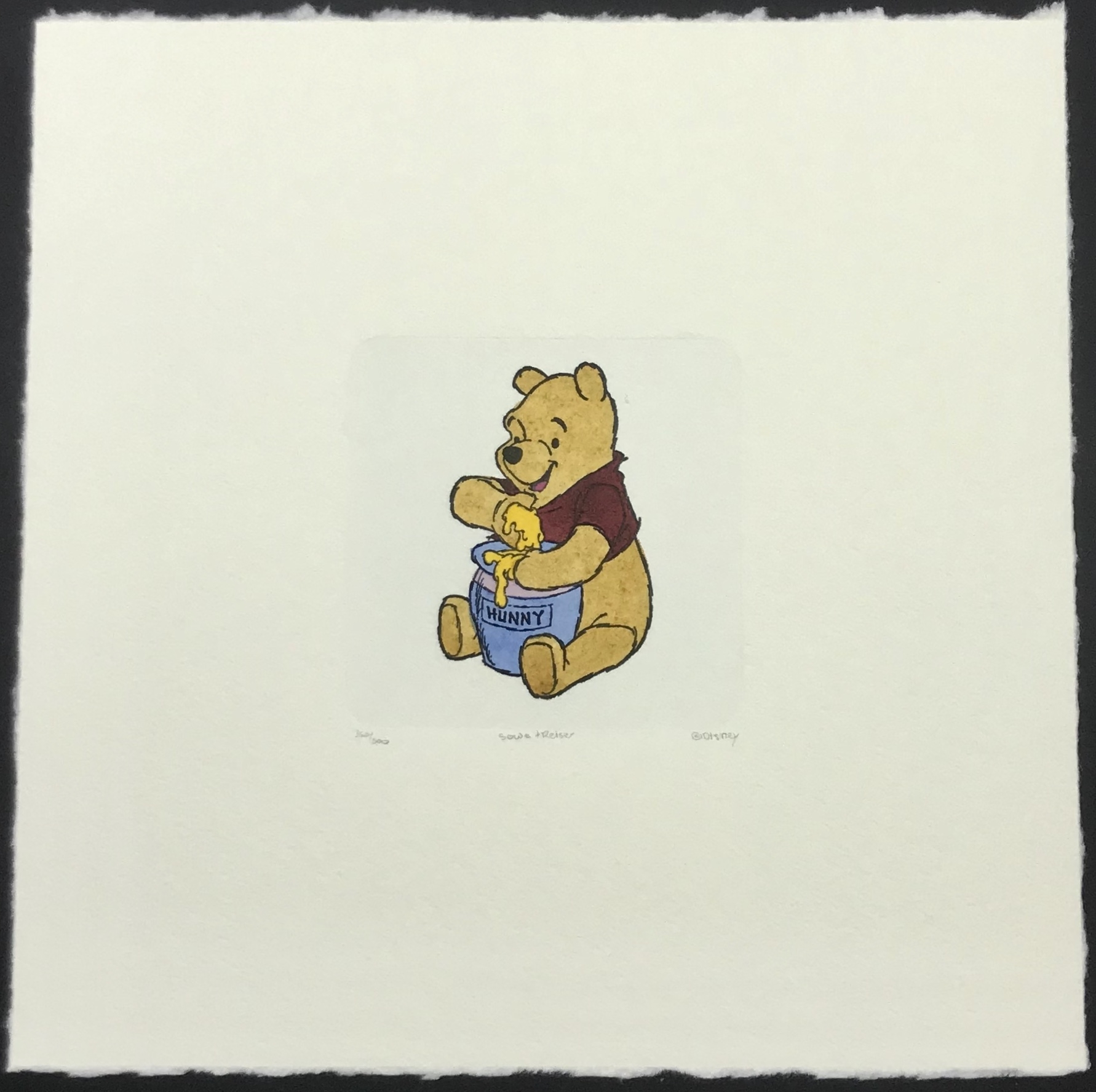 Winnie the Pooh with his beloved hunny pot in this sweet animation art etching. Available framed for only $129US!.