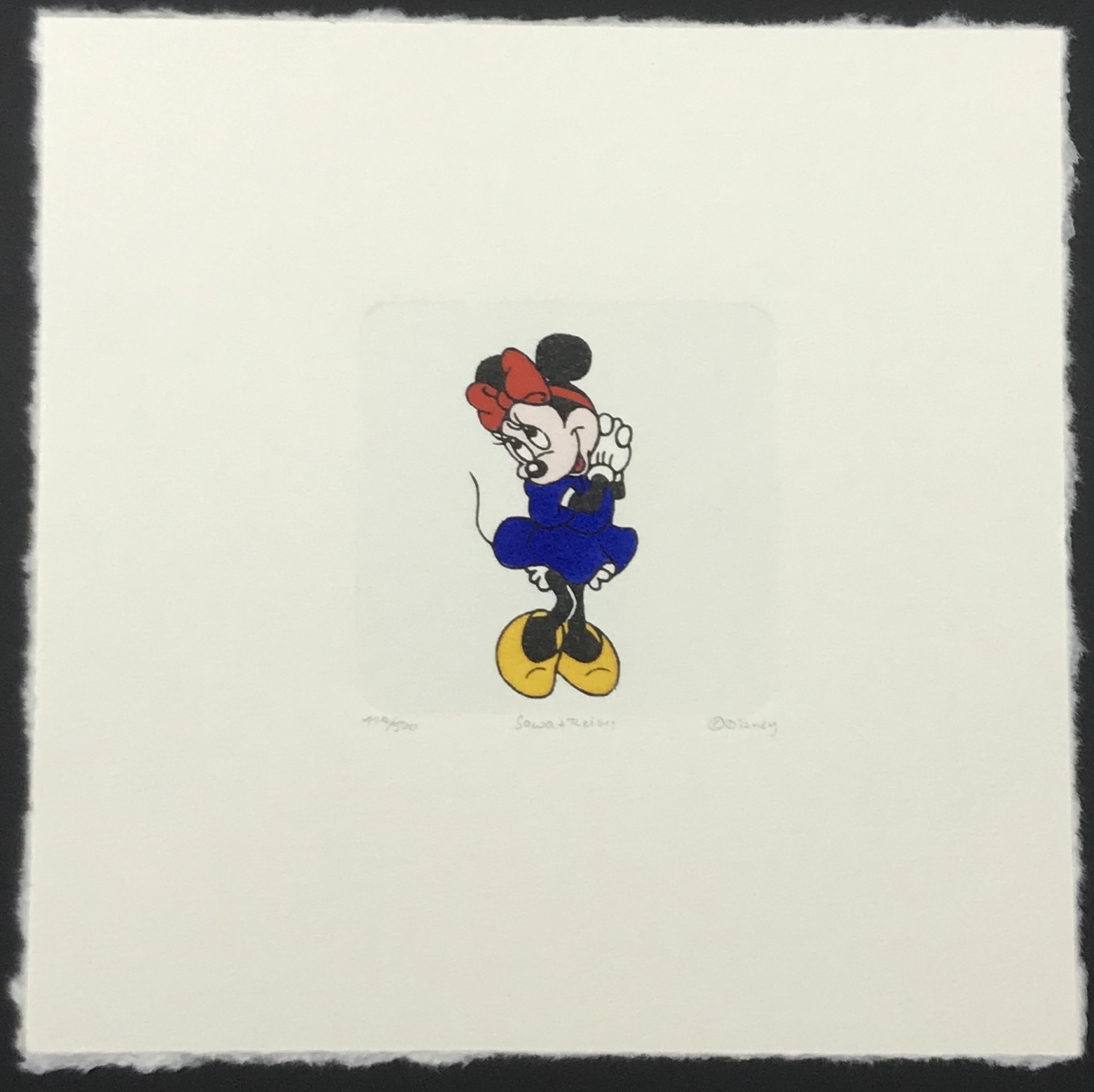 In order to create limited edition etchings, a studio-authorized artist etches or scrapes an image into a copper plate. This plate is then inked and pressed into high-quality acid-free rag paper to create the black outline of the character. Each piece is then meticulously hand-painted with watercolours to bring the image to life.