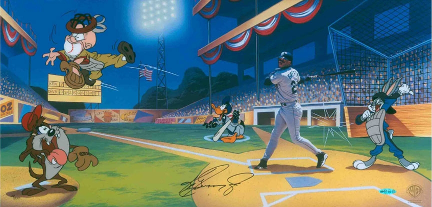 This is a hand painted limited edition cel signed by Ken Griffey Jr. It’s the big game! and this cel captures one of the Looniest moments that America’s Pastime has ever seen! Ken Griffey Jr., one of the greatest superstars ever to play the game connects on a pitch from the Taz, sending catcher Elmer Fudd on a solid “wine dwive” to center field. Daffy Duck kneels in the “on deck” circle, poised to follow Griffey in the betting line up. Officiating the game, umpire Bugs Bunny signals that he’s “outta there!” (obviously referring to the Flying Elmer…).