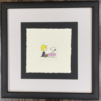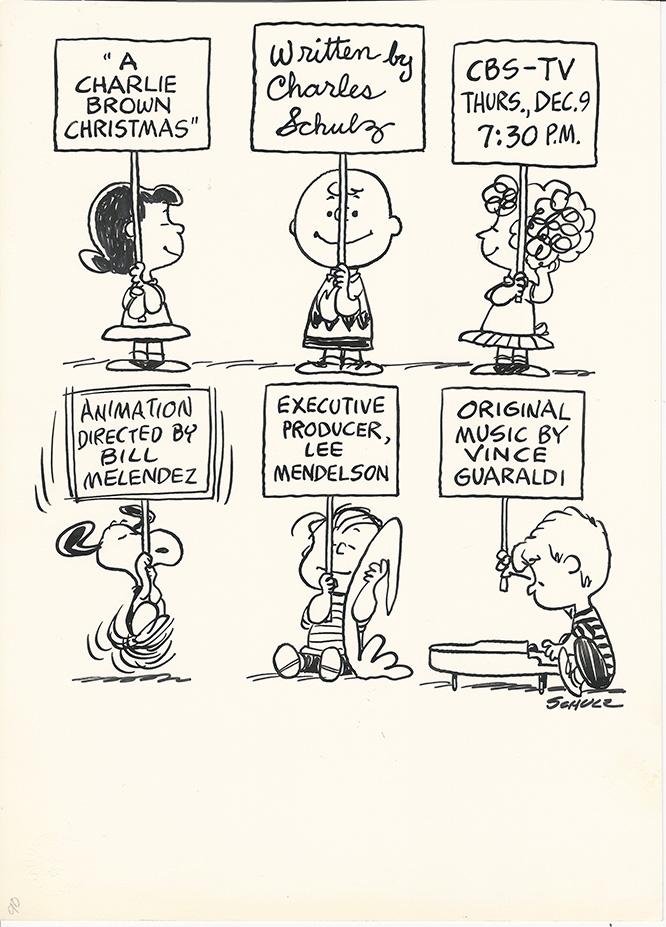 This is a limited edition giclee depicting an original pen and ink promotional drawing for the first airing of "A Charlie Brown Christmas". The print has been created on Arches 100% cotton rag fine art paper using archival inks. Featured here is Charlie Brown, Lucy, Frieda , Schroeder, Snoopy and Linus.