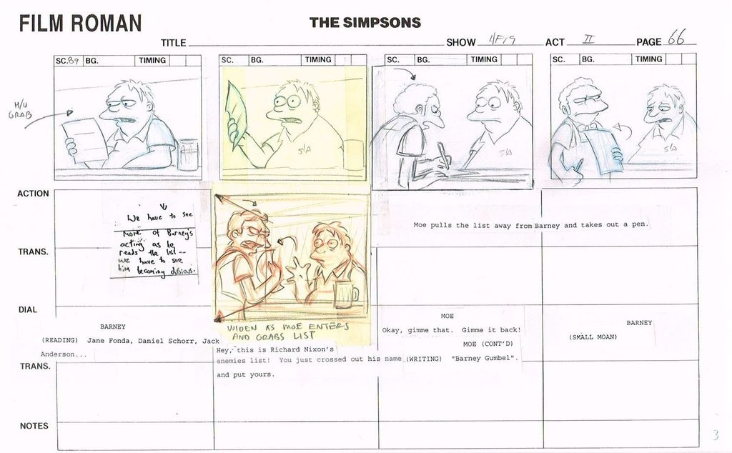 This is a rare original storyboard used in making "The Simpsons". Storyboards are where animation is created. Story lines, dialogue, action, settings, everything comes together at this crucial juncture before being passed on to the animation team to bring it to life. Storyboards are where the magic happens, and where animation directors do their most important work. What they lack in color and immediate visual impact, they more than make up for in rarity and creative authenticity. Storyboards are an important component of a serious animation art collection. This storyboard was used in making episode 4F19 "Homer's Enemy", May 4, 1997. Featured here is Moe and Barney.450