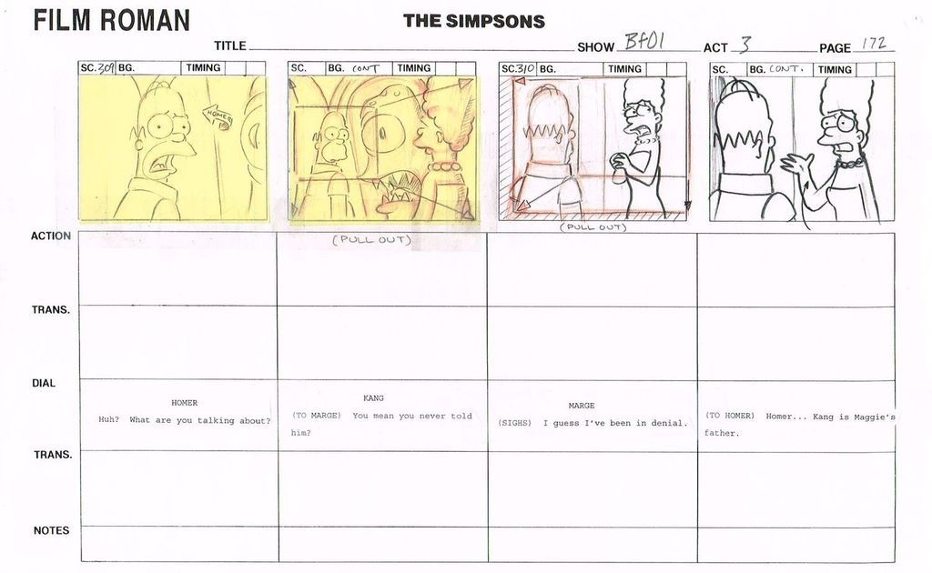 This is a rare original storyboard used in making "The Simpsons". Storyboards are where animation is created. Story lines, dialogue, action, settings, everything comes together at this crucial juncture before being passed on to the animation team to bring it to life. Storyboards are where the magic happens, and where animation directors do their most important work. What they lack in color and immediate visual impact, they more than make up for in rarity and creative authenticity. Storyboards are an important component of a serious animation art collection. This storyboard was used in making episode AABF01 "Treehouse of Horror IX" October 25, 1998.450