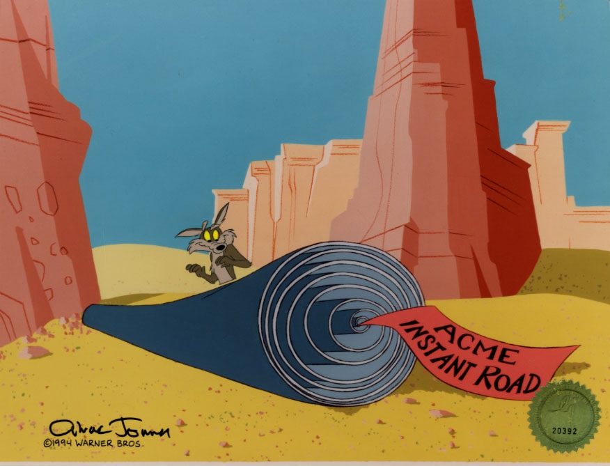 This is an original hand painted production cel used in making "Chariots of Fur" 1994. This has been personally signed by Chuck Jones. Featured here is Wile E. Coyote. 1300
