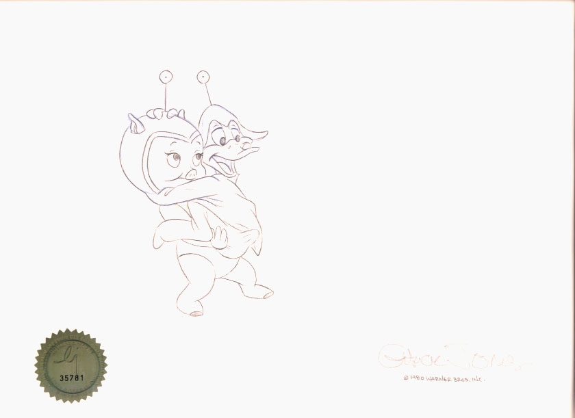 This is an original production drawing used in making "Duck Dodgers and the Return of the 24 1/2 Century" 1980. This original drawing bears the Autopen authentication of Chuck Jones. Featured here is Daffy Duck and Porky Pig.
