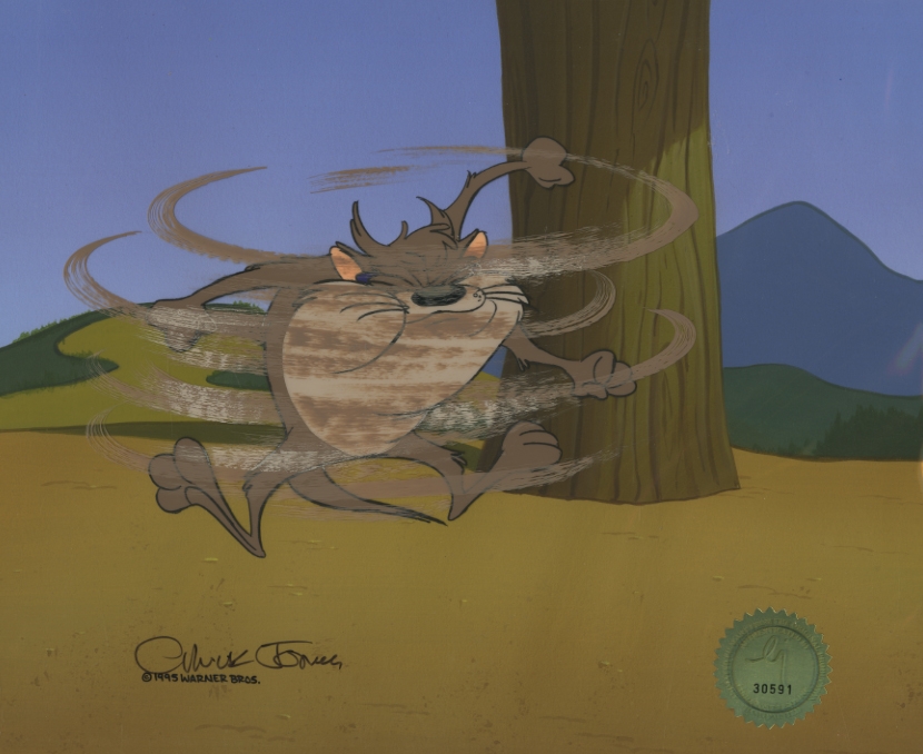 This is an original hand painted production cel used in making "Superior Duck" 1996. This was personally signed by Chuck Jones. Featured here is Taz.