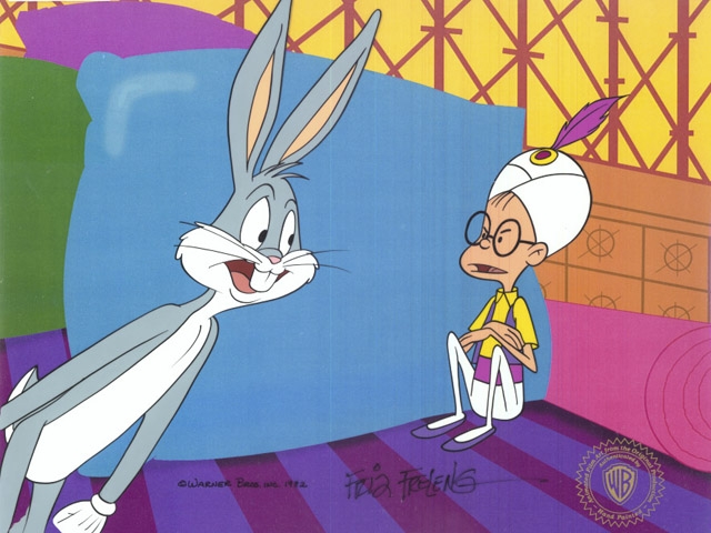 This is an original hand painted production cel used in making "1001 Rabbit Tales" 1982. This was personally signed by Friz Freleng. Featured here is Bugs Bunny and Genie.