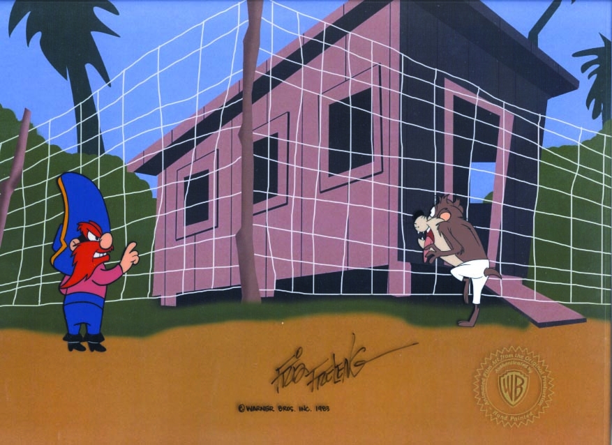 This is an original hand painted production cel used in making "Daffy Duck's Fantastic Island" 1983. This was personally signed by Friz Freleng. Featured here is Yosemite Sam and Taz.