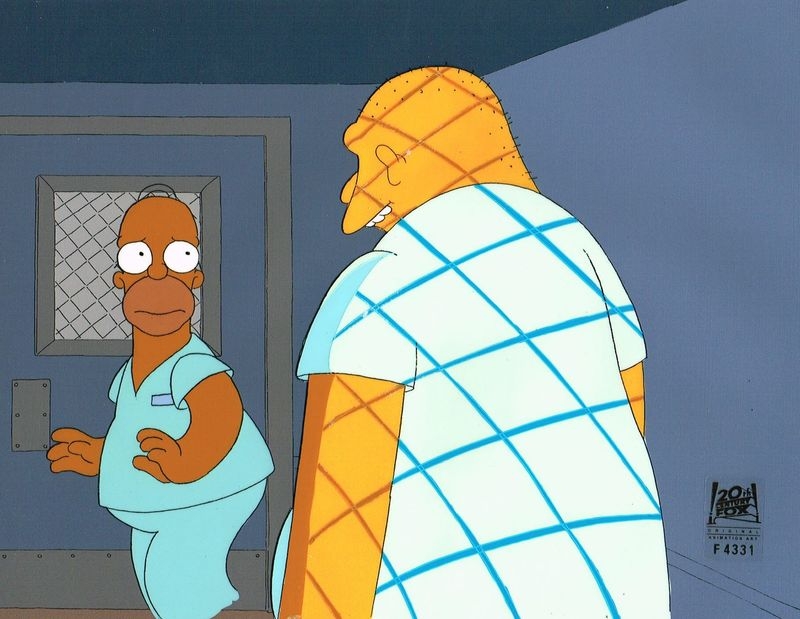 This is a hand painted production cel used in making an episode of "The Simpsons". Episode 7F24 "Stark Raving Dad" September 19, 1991. An inadvertent deviation from his norm lands Homer in a mental hospital, where he shares a cage with a large white man who thinks he's Michael Jackson. Featured here is Homer Simpson and Leon Kompowsky (voiced by Michael Jackson).