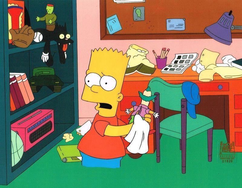 This is a hand painted production cel used in making an episode of "The Simpsons". Episode 5F13 "Bart this Little Wiggy" Season 9, episode 18. March 22, 1998. In this episode Marge invites Ralph Wiggum over for a play-date with Bart. When Bart goes back to the Wiggum household and finds it filled with police equipment and files, he is in a troublemaker's paradise. Featured here is Bart Simpson.