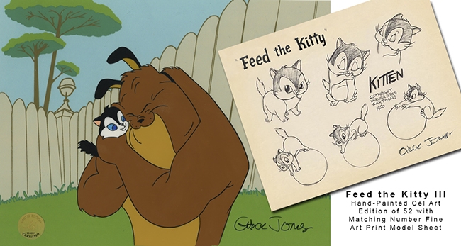 "Feed the Kitty III" is a hand-painted limited edition cel art edition accompanied by a fine art print of the original "kitten" model sheet. Featured here is Marc Anthony and Kitty. Although the iconic Chuck Jones-directed short animated film, "Feed the Kitty" premiered on February 2, 1952, work on it began as early as two years prior in 1950. Cited by film buffs, critics, and animation experts alike as one of Jones's masterpieces, "Feed the Kitty" is without a doubt a funny, heartbreaking, double-hanky lesson in great acting. Autopen signature. Model sheet can be framed separately for an additional $145US.