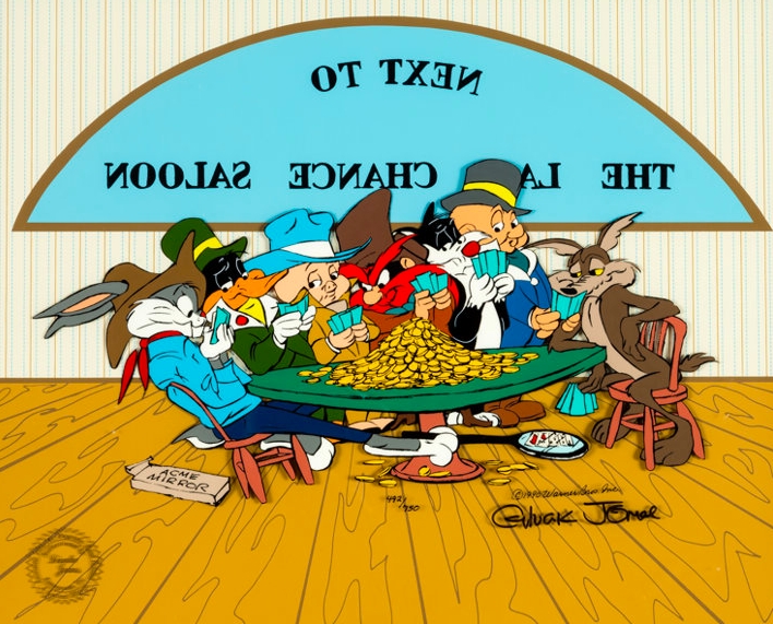 This is a hand painted limited edition cel. Chuck Jones released this follow-up after the instant success of the limited edition cel "Last Chance Saloon" in 1987. This hand-painted limited edition cel was created from an original Chuck Jones drawing featuring Bugs Bunny, Daffy Duck, Elmer Fudd, Porky Pig, Sylvester, Yosemite Sam and Wile E. Coyote. It also sold out instantly upon release. This is signed by Chuck Jones. 1600