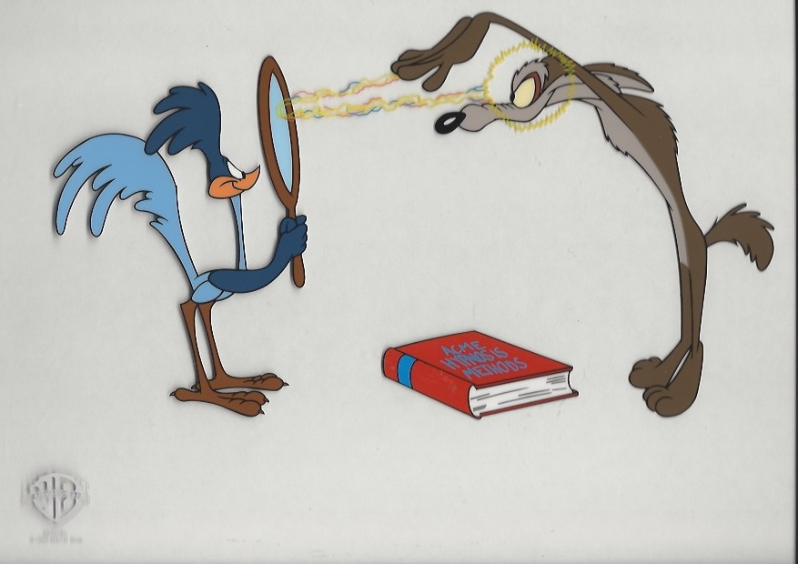 This is a limited edition serigraph cel titled "Acme Hypnotist". Featured here is Wile E. Coyote and Road Runner. Comes with gallery certificate of authenticity. 150