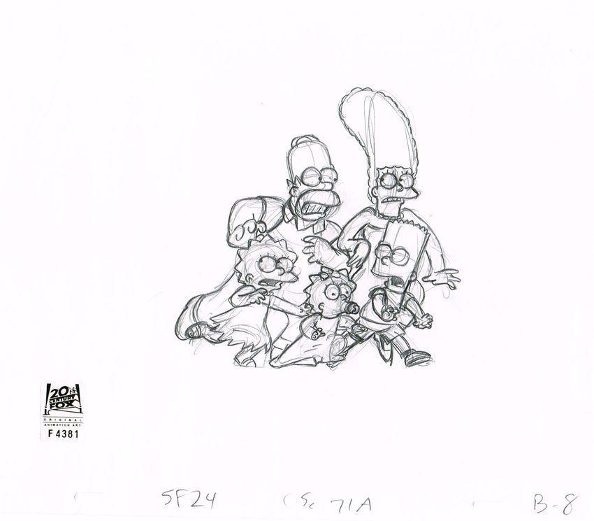 This is an original production drawing used in making an episode of "The Simpsons". Episode 5F24 title "All Singing, All Dancing" January 4, 1998. Marge and Lisa try to soften Homer's mood after he inadvertently rents a musical instead of an action movie. Featured here are Homer, Marge, Bart, Lisa and Maggie. 395