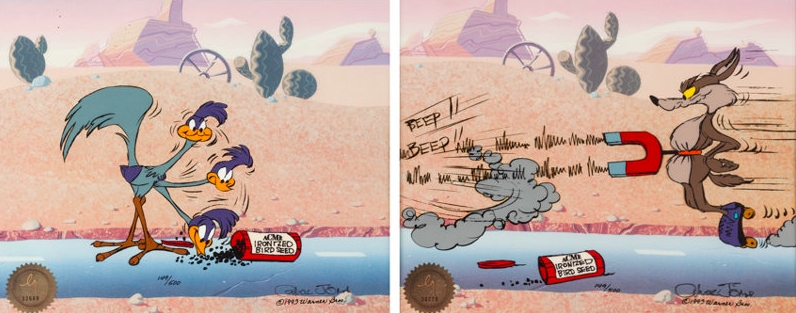 This is a long sold out double-aperture hand painted limited edition cel titles "Acme Bird Seed." It was created from an actual Chuck Jones gag drawing. In the first panel we see the Road Runner eating Acme ironized bird seed, and in the second panel, we see Wile E. Coyote with a magnet. I think we all know what's next! This piece has been sold out for many years and we are pleased to offer this to our collectors. Each cel has been signed by the late Chuck Jones. Available unframed. SOLD OUT ONLY ONE AVAILABLE.