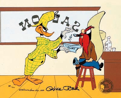 This is a hand painted limited edition cel featuring Daffy Duck and Sherlock Holmes and Yosemite Sam. Each is signed by the late Chuck Jones. 1250 Call for pricing 800-700-1173 or email Kelly contact@animationconnection.com