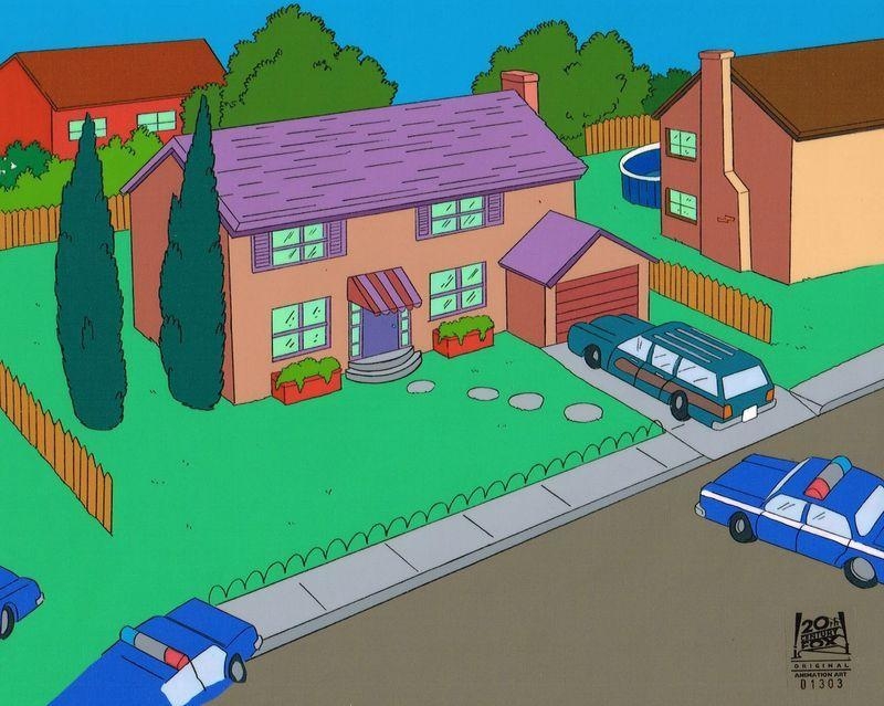 This is a hand painted production background used in making an episode of "The Simpsons". Episode 1F22 "Bart of Darkness" September 4, 1994. A really cool collectible for any Simpsons fan. Note: there is a small amount of paint flaking in bush on upper left corner.