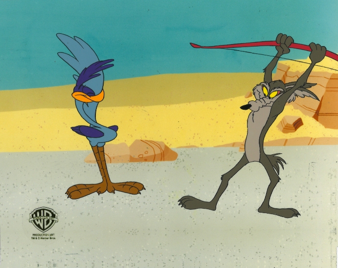 This is a hand painted production cel used in making "Chariots of Fur" 1994. Featured here is Wile E. Coyote and Road Runner. Two frames have been placed together to showcase Wile E. Coyote and Road Runner together. 675