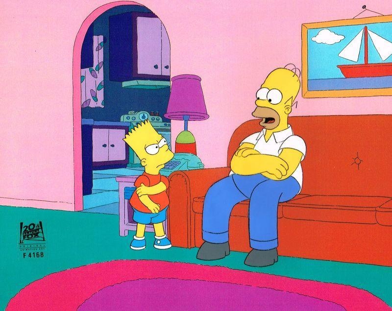 This is an original hand painted production cel used in making an episode of "The Simpsons". Episode 78F08 title "Flaming Moe's" November 21, 1991. Featured here is Bart Simpson and Homer Simpson.625