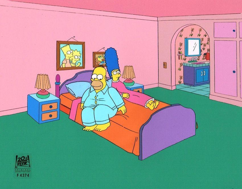 This is a hand painted production cel used in making an episode of "The Simpsons". Episode 3F05 "King Sized Homer" November 5, 1995. In the episode, Homer despises the nuclear plant's new exercise program and decides to gain 61 pounds (28 kg) to claim a disability and work from home. Featured here is Homer Simpson and Marge Simpson.790