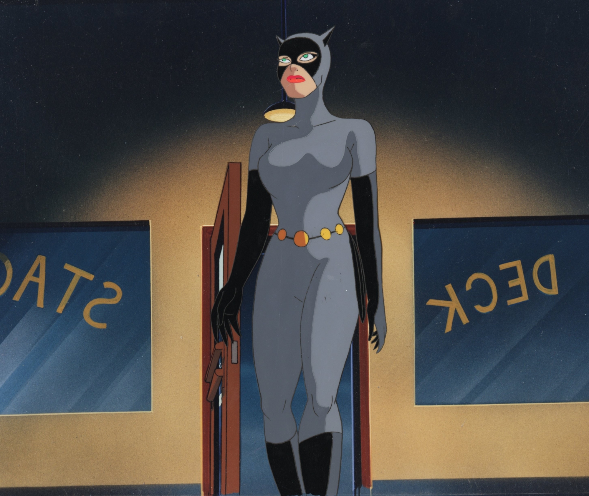 This is an original hand painted production cel. Featured here is Catwoman. This was used in making Batman: The Animated Series "Batgirl Returns" 1992.