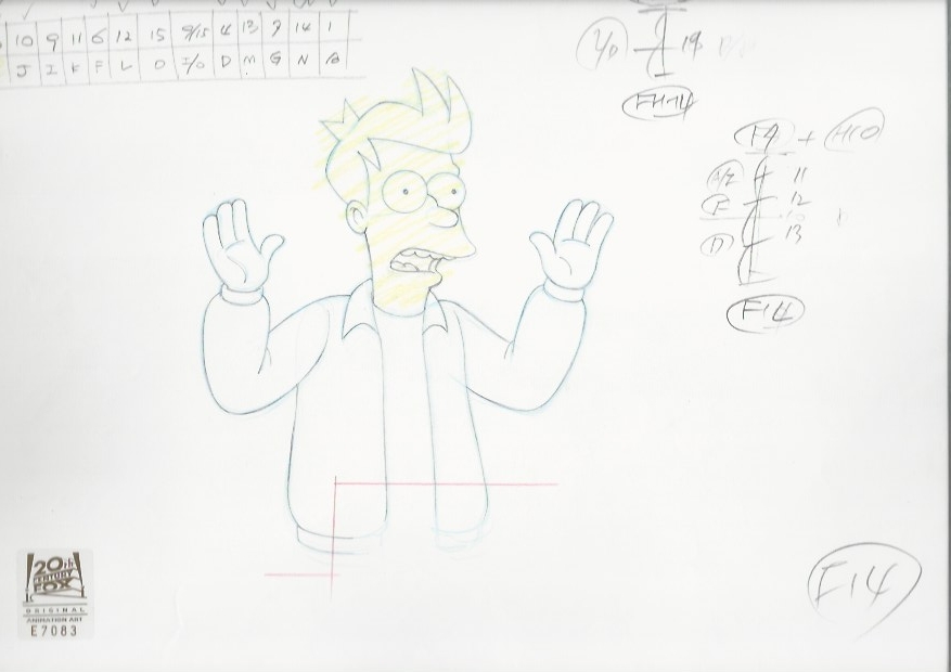 This is an original production drawing used in making an episode of "Futurama". Episode 5ACV08 titled "The Beast with a Billion Backs". Oct. 19, 2008. Featured here is Fry.200