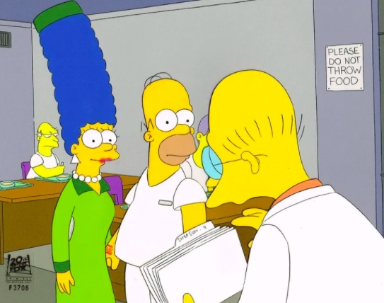 This is an original hand painted production cel used in making an episode of "The Simpsons". Episode 7F24 titled "Start Raving Dad" September 19, 1991. Featured here is Homer Simpson and Marge Simpson.