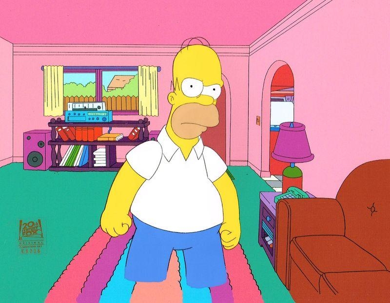 This is an original hand painted production cel used in making an episode of "The Simpsons". Episode DABF09 title "The Old Man and the Key" March 10, 2002. Grandpa tries to impress an attractive new woman (guest voice Olympia Dukakis) at the nursing home by showing off his driving skills. Featured here is Homer Simpson.