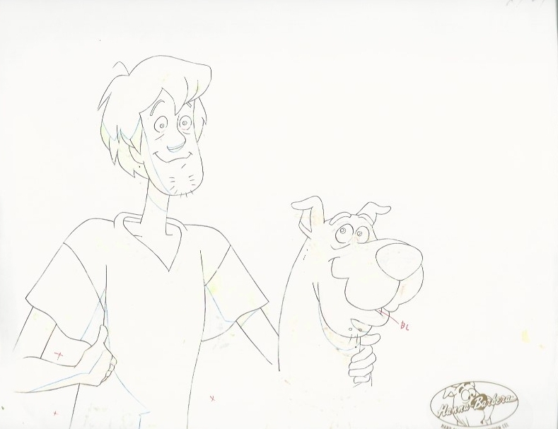 This is an original production drawing used in making "Scooby Doo, Where Are You?" 1969. The show featured brainiac Velma, jock Fred, fashionista Daphne, hippie Shaggy, and Shaggy's talking Great Dane, Scooby-Doo, climb into their green van, the Mystery Machine, and hit the road in search of weird phenomena to solve. And even when Scooby and the gang aren't actively searching for them, mysteries just have a way of falling into their laps. Ruh-roh! Featured here is Scooby Doo and Shaggy. This comes with the original production cel.
