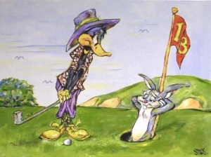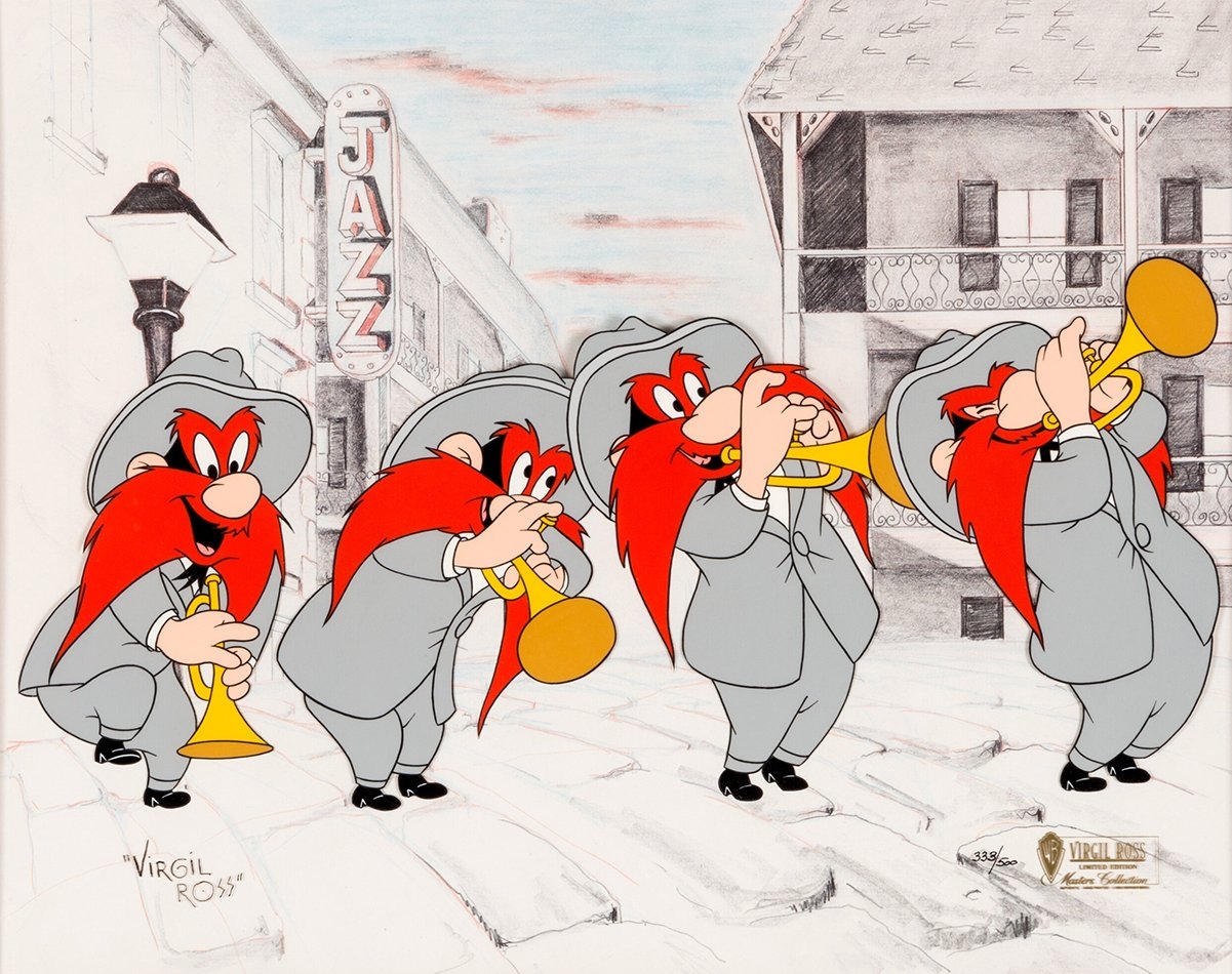 This is a hand painted limited edition cel. Yosemite Sam serenades us with his horn playing. This is signed by Virgil Ross. Featured here is Yosemite Sam.