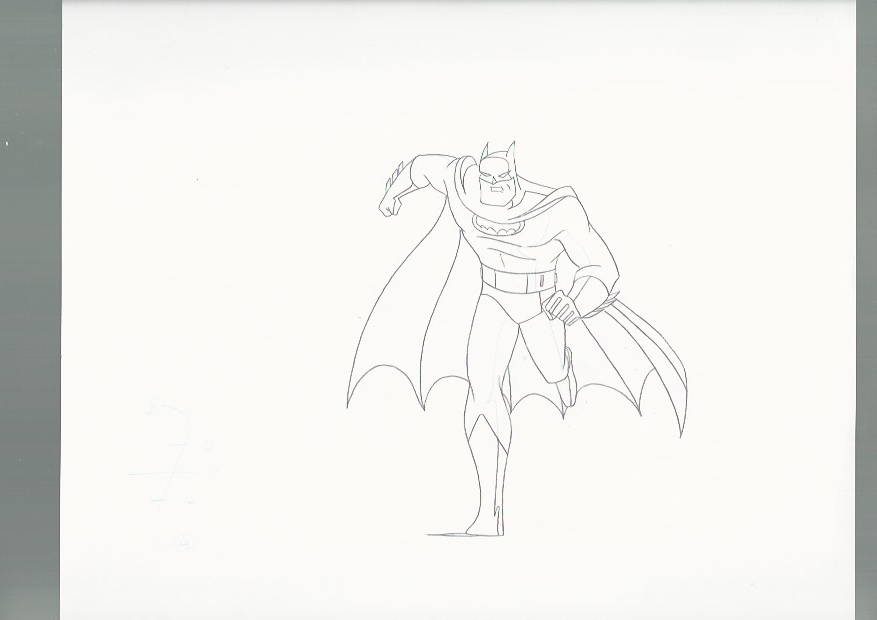 This is an original production drawing of Batman used in making an episode of "Batman: The Animated Series" episode title "The Lion and the Unicorn" 1992. Featured here is Batman.