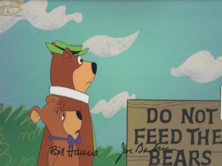 This is an original hand painted animation production cel Yogi Bear and Boo Boo. This cel has been personally signed by Bill Hanna and Joe Barbera.