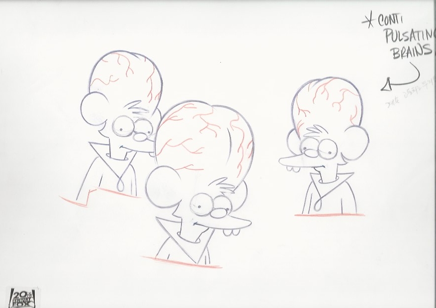 This is an original production drawing used in making "The Simpsons" Episode 1F22 "Bart of Darkness" September 4, 1994. In the episode, Bart breaks his leg and becomes increasingly isolated in his room. He starts spying on neighbors with a telescope and begins to suspect that Ned Flanders has murdered his wife. Featured here is Itchy.