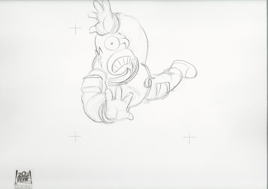 This is an original production drawing used in making "The Simpsons" Episode 1F13 "Deep Space Homer" February 24, 1994. Homer and Barney are recruited by NASA to make it more appealing to the man in the street, and when Barney falls off the wagon, Homer is chosen to go into space. Featured here is Homer Simpson.