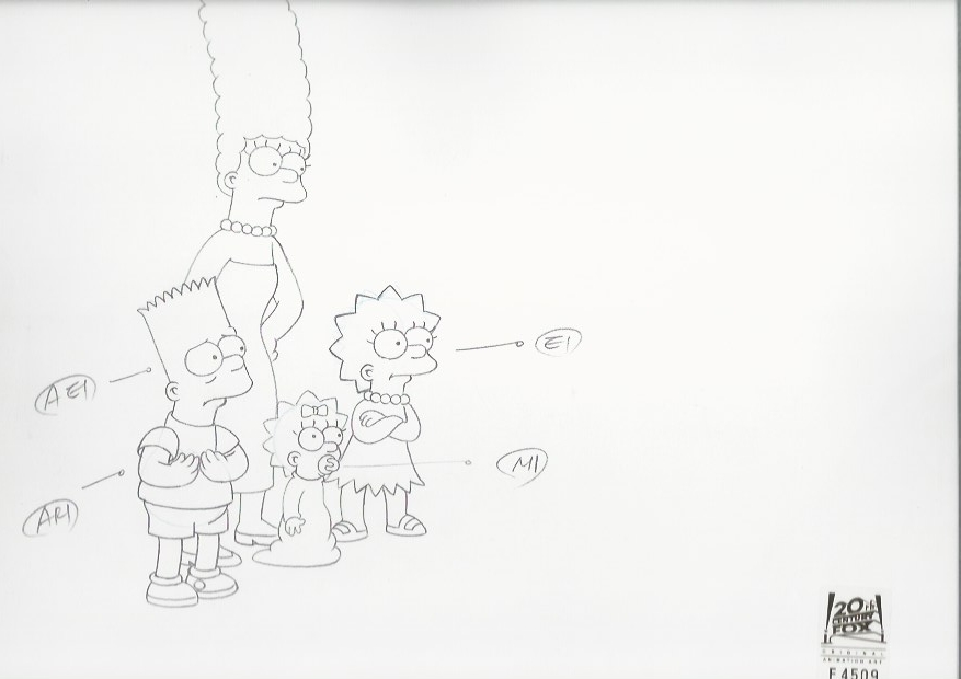 This is an original production drawing used in making "The Simpsons" Episode HABF06 "The Seemingly Neverending Story" March 12, 2006. In this episode Lisa tells an epic tale. Chased by a sheep, she meets Burns, who tells her about a Texan and a scavenger hunt, which results in Burns losing the power plant, but how does Bart's geography test fit in? Featured here is Marge Simpson, Bart Simpson, Lisa Simpson and Maggie Simpson.