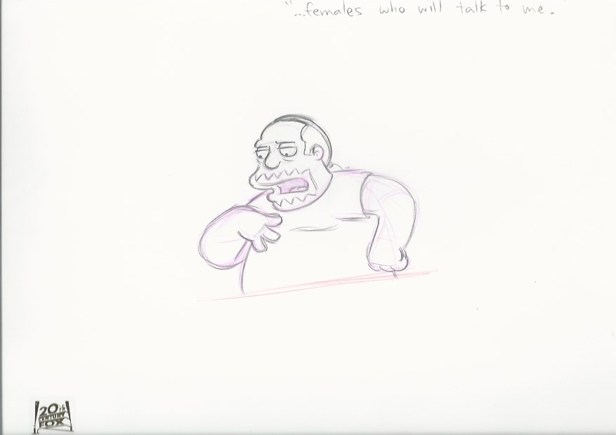 This is an original production drawing used in making "The Simpsons". Episode FABF12 "My Big Fat Geek Wedding" April 18, 2004. In this episode On the eve of her wedding to Principal Skinner, Edna Krabappel hears that her fiancé's getting cold feet, so she calls it off. With Homer's help, can Seymour win back his lady? Featured here is Comic Book Guy.
