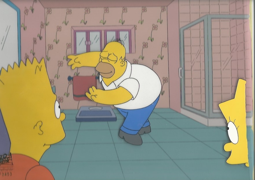 This is an original hand painted production cel used in making an episode of "The Simpsons". Episode 3F05 titled "King-Size Homer" November 5, 1995. In the episode, Homer despises the nuclear plant's new exercise program and decides to gain 61 pounds (28 kg) to claim a disability and work at home. Featured here is Homer Simpson, Bart Simpson and Lisa Simpson.