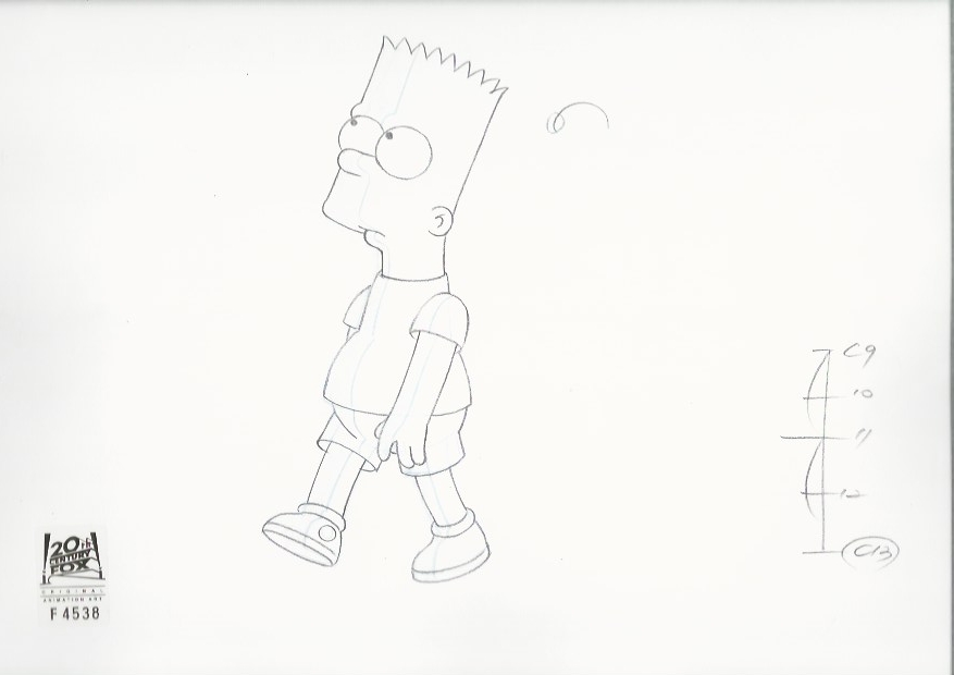 This is an original production drawing used in making "The Simpsons". Episode HABF06 "The Seemingly Never-Ending Story" March 12, 2006 (Season 17). Lisa tells an epic tale. Chased by a sheep, she meets Burns, who tells her about a Texan and a scavenger hunt, which results in Burns losing the power plant, but how does Bart's geography test fit in?. Featured here is Bart Simpson.