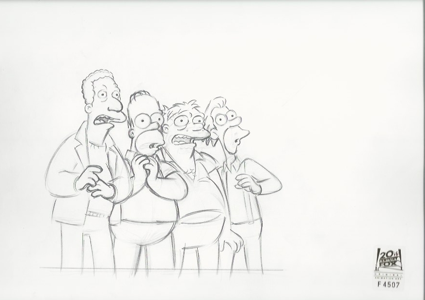 This is an original production drawing used in making "The Simpsons". Episode HABF06 "The Seemingly Never-Ending Story" March 12, 2006 (Season 17). Lisa tells an epic tale. Chased by a sheep, she meets Burns, who tells her about a Texan and a scavenger hunt, which results in Burns losing the power plant, but how does Bart's geography test fit in?. Featured here is Homer Simpson, Barney, Lenny and Carl.
