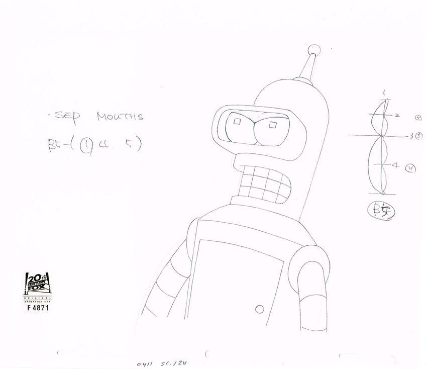 This is an original production drawing used in making an episode of "Futurama". Episode 4ACV11 title "Where No Fan Has Gone Before". Original air date April21, 2002 (Season 4). Fry must defend his trip to Omega 3 to retrieve all 79 episodes of "Star Trek." Guest voices: William Shatner, Leonard Nimoy, Walter Koenig, George Takei and Nichelle Nichols. Featured here is Bender.