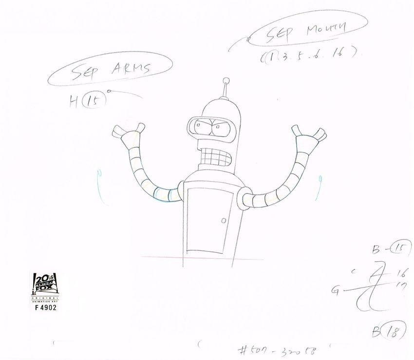 This is an original production drawing used in making an episode of "Futurama". Episode 5ACV07 title "The Beast with a Billion Backs". Original air date June 24, 2008 (Season 5). As space rips open, revealing a gateway to another universe, a repulsive, planet-sized monster armed with tentacles and amorous intentions lies in wait. Featured here is Bender.