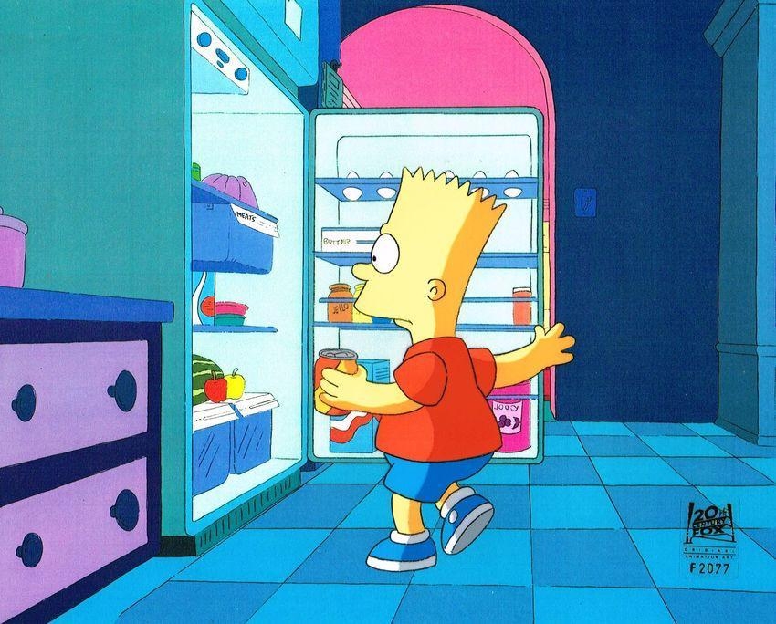 This is an original hand painted production cel used in making an episode of "The Simpsons". Episode 8F08 titled "Flaming Moe's" November 21, 1991. In this episode a local bartender steals Homer's secret recipe for a bizarre drink called the "Flaming Homer" and becomes rich. Featured here is Bart Simpson.