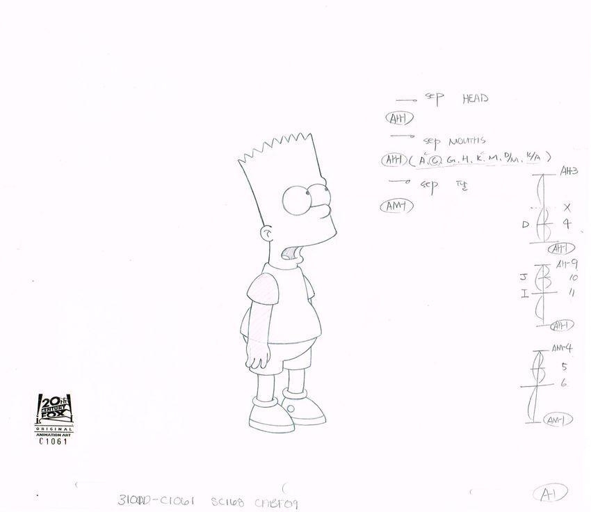 This is an original production drawing used in making "The Simpsons". Episode CABF09 "Hungry, Hungry Homer" March 4, 2001. In the episode Homer becomes a Good Samaritan after discovering the simple joys of helping people in need – which is put to the test when he goes on a hunger strike after the owner of the Springfield Isotopes baseball team attempts to discredit him when Homer stumbles on his plot to discreetly move the team to Albuquerque, New Mexico. Featured here is Bart Simpson.