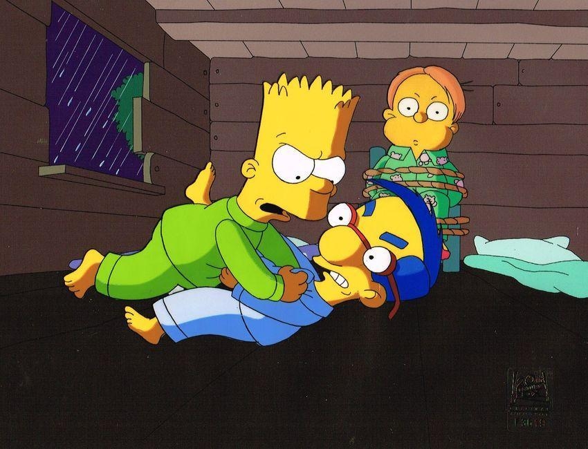 This is an original production cel used in making an episode of "The Simpsons". Episode 7F21 "Three Men and a Comic Book" May 9, 1991 season 2. Featured here is Bart Simpson, Martin Prince and Milhouse.