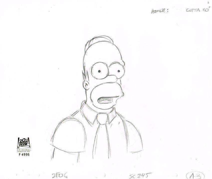 This is an original production drawing used in making an episode of "The Simpsons". Episode 2F06 titled "Homer Badman" November 27, 1994 (Season 6). After retrieving a piece of candy stuck to a college co-ed's pants, Homer becomes public enemy number one when the co-ed accuses Homer of touching her butt and the media makes Homer out to be a pervert. Featured here is Homer Simpson.