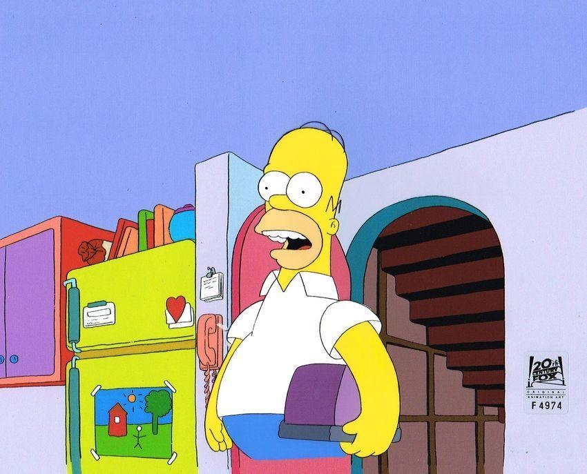 This is a hand painted production cel used in making an episode of "The Simpsons". Episode 2F03 "Treehouse of Horror V" October 30, 1994. Featured here is Homer Simpson.