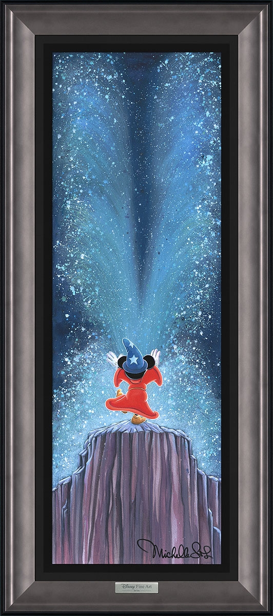 This is a limited edition giclee on canvas and comes framed as you see it, ready to hang. Featured here is Mickey Mouse from "Fantasia" by Disney artist Michelle St. Laurent. Contact us for shipping quote outside of North America.