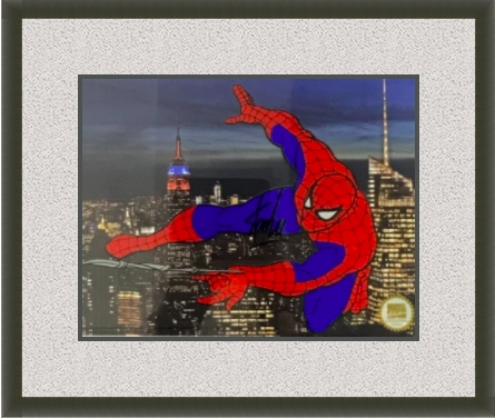 A great animation cel for Spiderman fans! Signed by Marvel Comics founder and Spiderman co-creator Stan Lee. Featured here is Spiderman. Sold framed. This is the last one available.