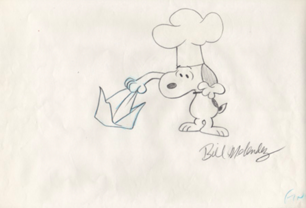 This is an original production drawing that has been personally signed by the late Bill Melendez. This was used in the making of "A Charlie Brown Thanksgiving" 1973. Featured here is Snoopy.
